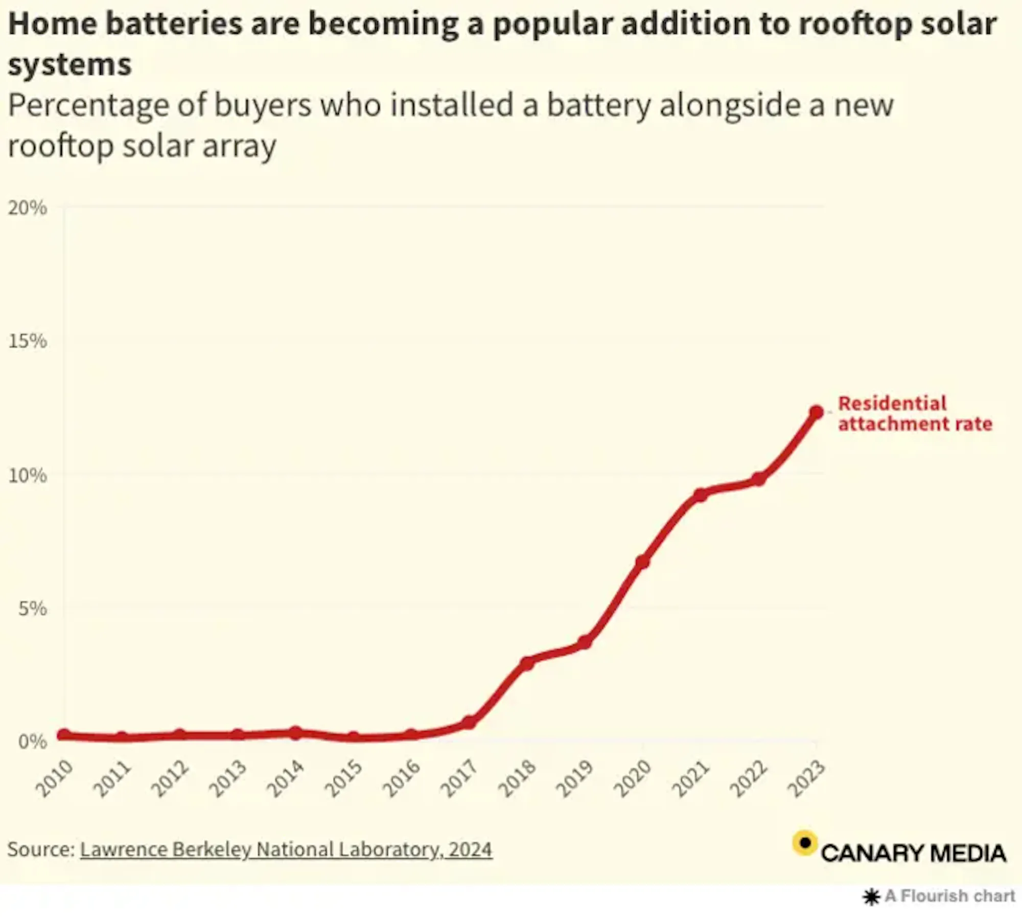Canary Media: "Chart: More and more rooftop solar buyers are adding home batteries." The proportion of people who install a backup battery in conjunction with rooftop solar is ramping up impressively in the U.S., according to a new report from Lawrence Berkeley National Laboratory or LBNL  The so-called 'residential attachment rate' was less than 10% in 2022, then 12.3% last yr, but projected to reach 25% this yr.  Unexpectedly, the country's rooftop solar market was impacted—mainly by policy changes in California—as "the Golden State’s net-metering program took effect, slashing the rate at which rooftop solar owners could sell surplus power to the grid but boosting the value of batteries, which enable homeowners to save their solar power for the times when it’s most valuable." Thus solar installations are projected to fall 19% this yr while the attachment rate in California rose to 14% last yr. But policy is not the only driver. "Extreme weather events, made more frequent by climate change, are increasingly threatening grid reliability." Furthermore, batteries continue to become more affordable. "And rising utility rates are making the economics of solar-plus-storage more attractive to homeowners." Cost of electricity is especially a factor in Hawaii, which had the country's highest charges last yr, but also the highest residental battery installation rate, at 95%. "Big, utility-scale battery projects are being built across the nation at a rate that would have been hard to fathom just a few years ago." But these new data from the LBNL show a similar upward progression for home battery systems, too. We built a new home in 2019 with solar + batteries, which allowed us to weather 6 brief grid outages this yr already.  Resilience should be the organizing principle, at both local + grid level.
