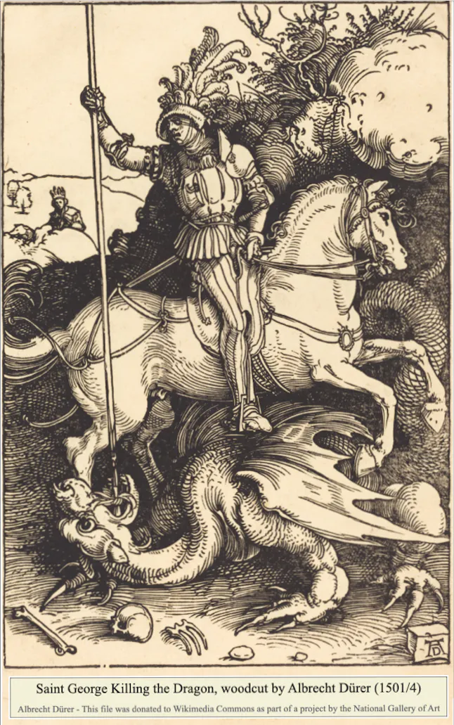 So—to the story. “Saint George and the Dragon is a legend in which Saint George—a soldier venerated in Christianity—defeats a dragon.” An evil beast in a cave was extorting tribute of “livestock + trinkets” until the villagers instead began offering up human sacrifices; the princess herself was finally chosen. As she fearfully approached the cave our heroic George encountered her + asked why she was crying. “The princess told the saint about the dragon’s atrocities and asked him to flee immediately, in fear that he might be killed too. But the saint refused to flee, slew the dragon, and rescued the princess.” The pre-Christian origins include Jason and Medea, Perseus and Andromeda, Typhon, + others. Originally the tale was attached to other saints, + “particularly attributed to Saint Theodore Tiro in the 9th and 10th centuries…[then] first transferred to Saint George in the 11th century. Honored on this day historically perhaps, but dating back through multiple permutations over millennia.