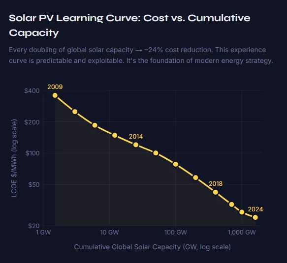 But here's the strategic insight most people miss: the early adopters who paid $378/MWh weren't just buying energy. They were funding the learning that made $24/MWh possible for everyone who came after them. Early movers absorbed the cost. Late movers harvested the savings.